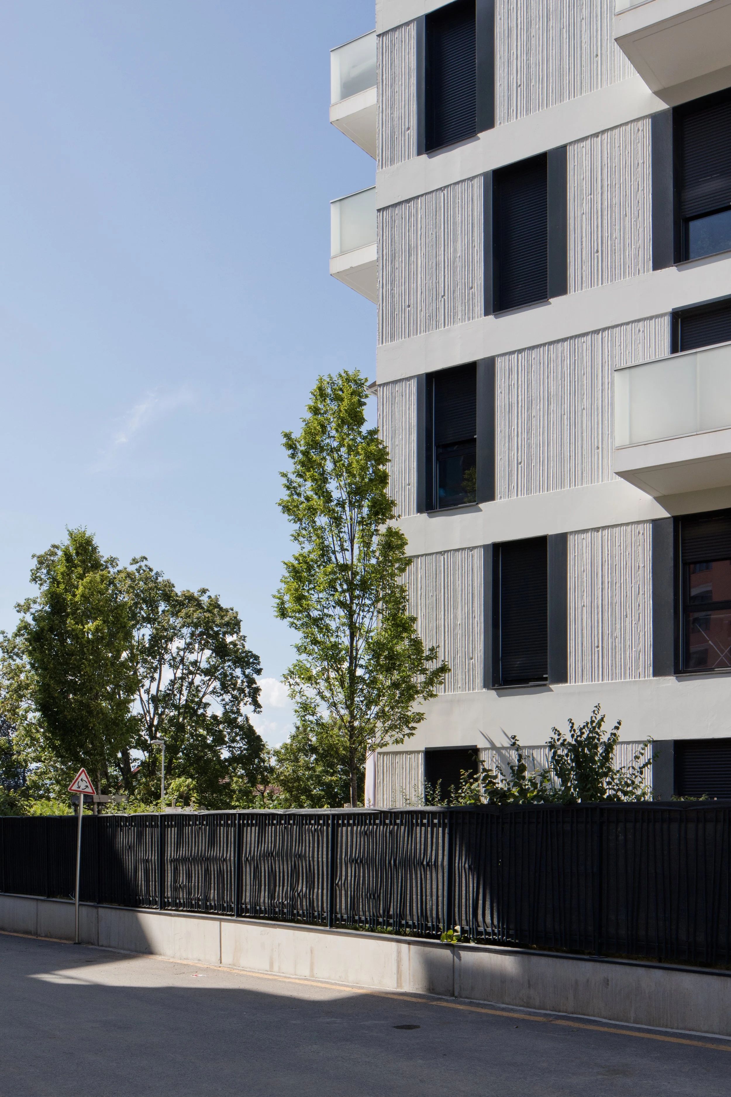 Contrastant avec l’hétérogénéité urbaine dans laquelle il se situe, cet ensemble de logements constitue une figure compacte, rassurante et solide. A l’instar des anciennes écoles communales, il forme un U autour d’une cour arborée où se dessine une étendue d’espaces verts.